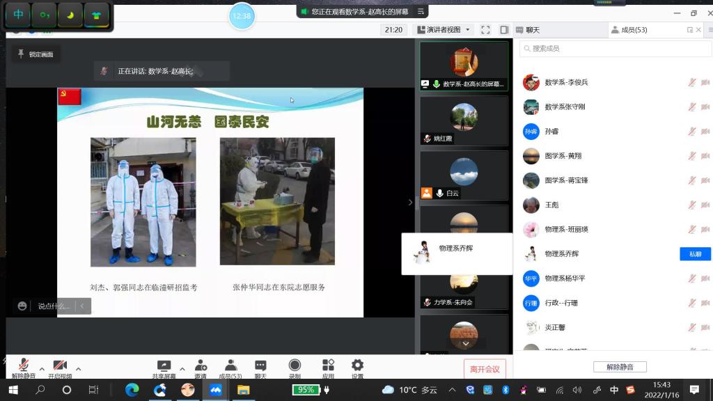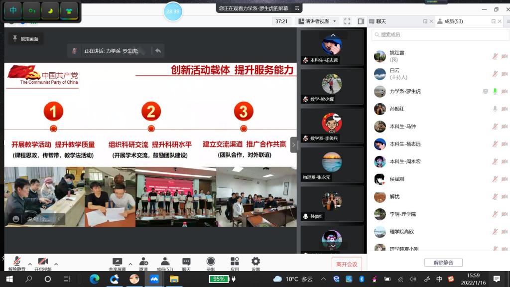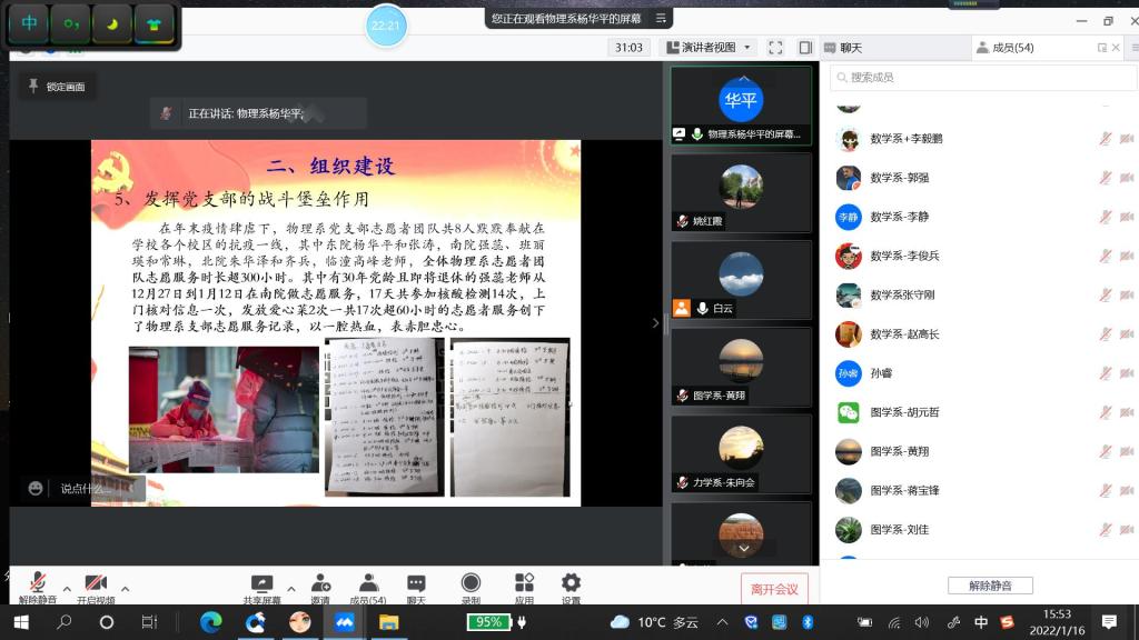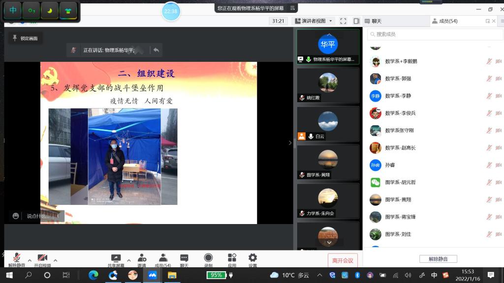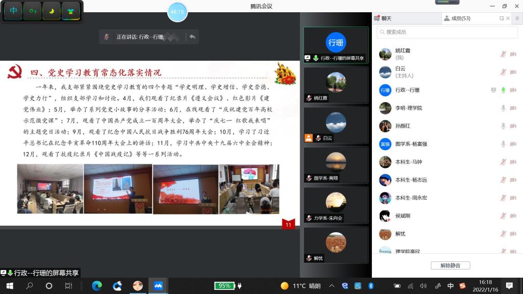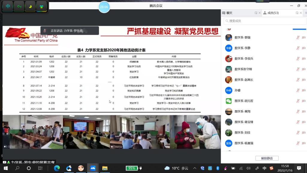 2022年1月16日下午,体育365官网以腾讯会议平台召开了2021年度党支部书记抓党建述职评议考核会议。体育365官网全体班子成员、党委委员、党支部书记及支委、系主任及党内外代表共53人参加会议。