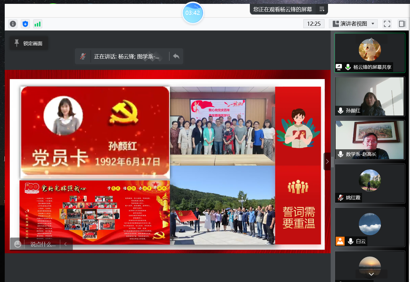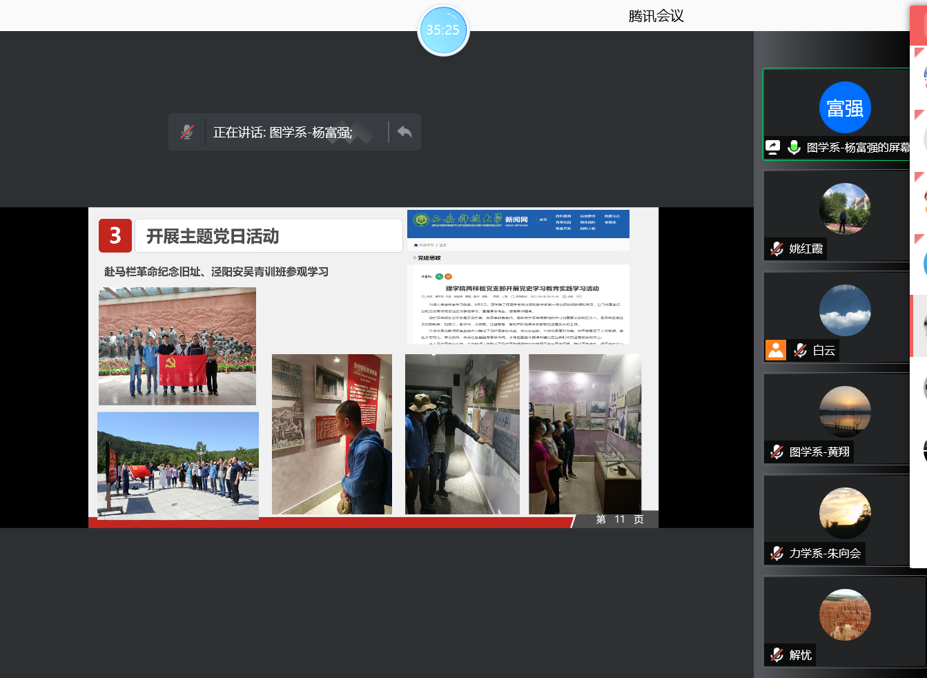 会议由党委书记孙颜红主持,7位党支部书记分别围绕党史学习教育、政治理论学习、履行党建工作第一责任人职责、严肃党内政治生活、强化政治功能、“我为师生办实事”实践活动、特色工作、存在不足及下一步工作思路等方面进行了在线述职汇报。