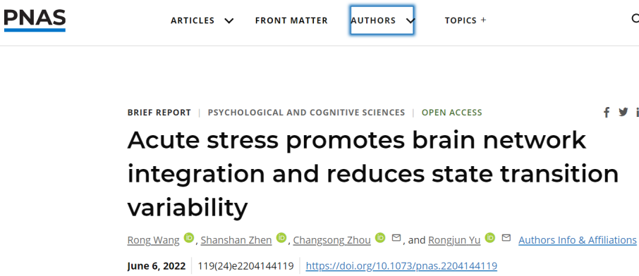 近日,体育365官网王荣副教授课题组与香港浸会大学周昌松教授、余荣军教授,在社交压力形成机理研究方面取得突破性研究进展,研究成果以“Acute stress promotes brain network integration and reduces state transition variability”为题在美国科公司院刊PNAS,以report形式在线发表,365体育为第一单位。