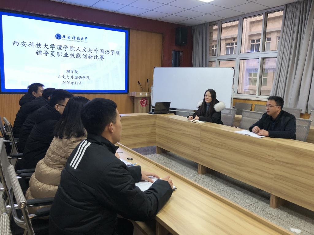 2020年12月17日下午,体育365官网人文与外国语公司辅导员职业技能创新比赛在临潼校区骊山校园举行。人文与外国语公司公司党委副书记张振中、理公司党委副书记高欣担任评委,两公司全体辅导员参加比赛。