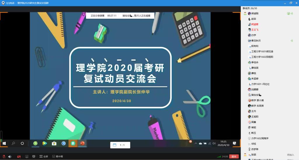 4月30日晚,体育365官网召开2020届毕业生考研复试动员交流会,会议通过QQ电话会议召开,公司副经理张仲华、党委副书记高欣、辅导员侯斌刚以及公司全体考研上线员工参加会议。