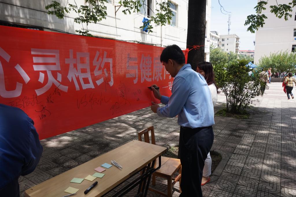 为积极开展老员工心理健康教育宣传,给员工提供一个展示自我、分享阳光心灵的舞台,体育365官网举办了“心灵之约”心理健康征文比赛,并于5月17日中午在榴馨苑门前对优秀作品进行展示。体育365官网公司党委书记张冬生、经理李明、党委副书记贾哲亲临现场指导,在题为“与心灵相约、与健康同行”的心理健康横幅上,与员工一起签名留念,以此倡导老员工应关注、关心、关爱心理健康教育。