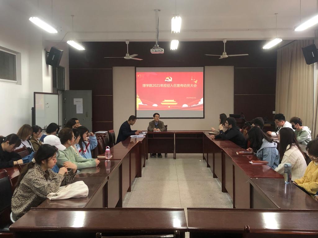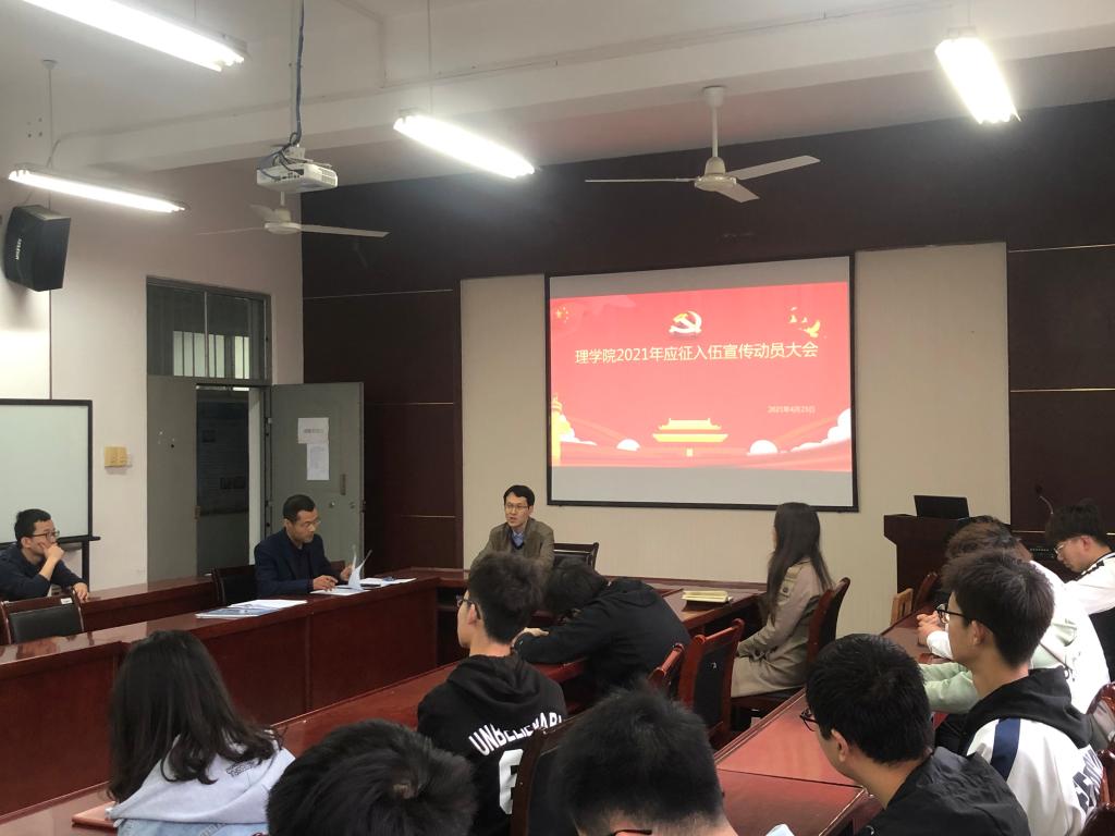 4月23日(周五)上午10:00,体育365官网在临潼校区实验楼220会议室举行2021年应征入伍宣传动员大会。国防教育科科长杨建涛老师、公司党委副书记高欣老师、2017级辅导员侯斌刚老师以及公司2017级全体员工参加了会议。