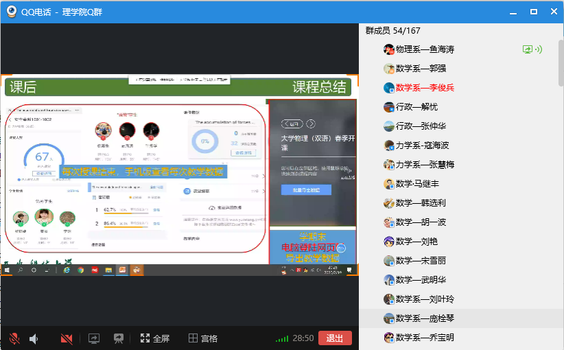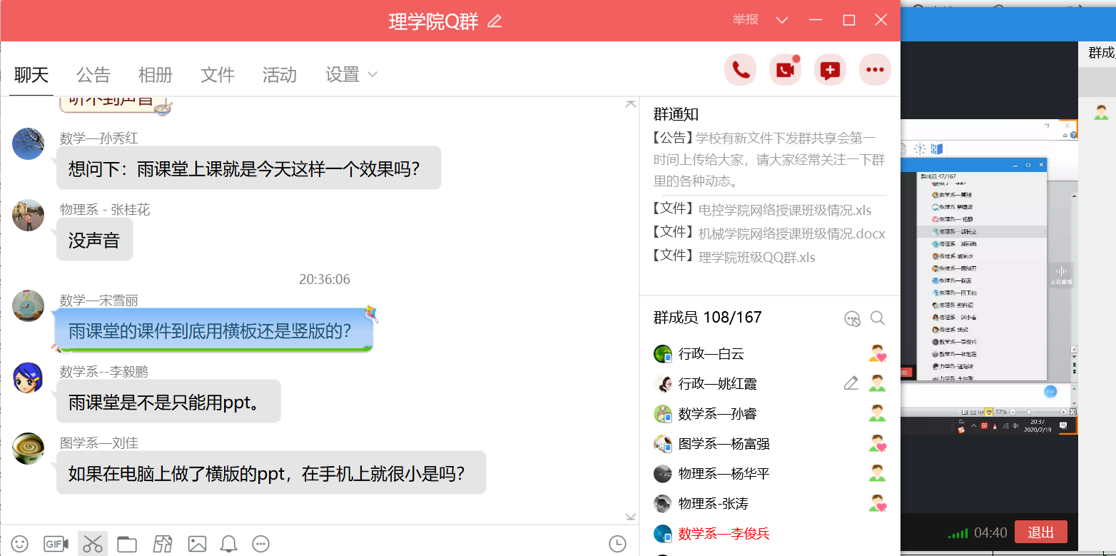 2月19日晚,体育365官网使用“腾讯视频”进行在线教学工作培训,培训会邀请物理系教师、教育部智慧教学之星鱼海涛副教授和数学系刘杰副教授分别以“如何利用学堂云及雨课堂快速部署线上教学”和以“基于超星学习通的混合式教学”为主题,从网络课程模式探讨、雨课堂移动端和PC端的使用、超星学习通的使用及线上教学常见问题等方面进行了细致地讲解,分享了线上教学模式的组织、教学方法和经验。并对大家的提问进行了详细解答。