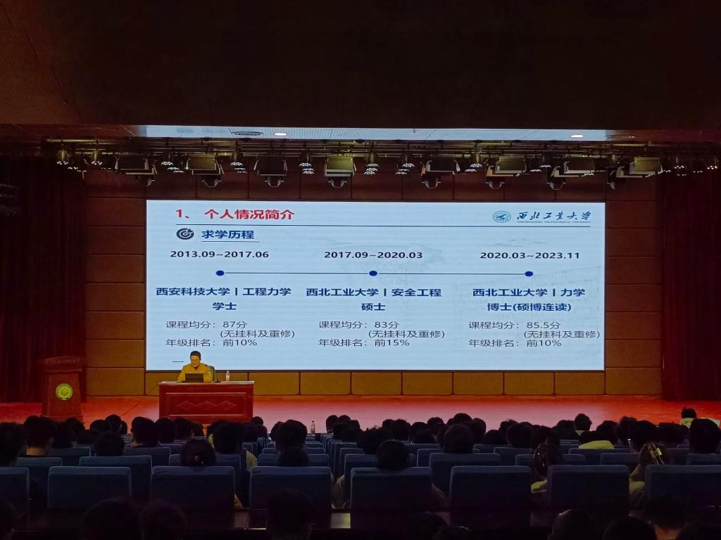 张显涛以“探索学业与学术之路:从西科大到西工大的求学历程 ”为题展开本次报告。首先,张显涛分析了就业和考研两个方面的利弊关系,希望同学们多方位了解自己的专业发展方向,全方位收集讯息。接着,他通过分享自己在课题组的学习生活和科研成就,让同学们了解到航空方面的知识,感受科研生活的乐趣。最后 ,他强调,在学习中要充分发挥主观能动性,希望同学们有一个充实的老员工活,不忘初心。