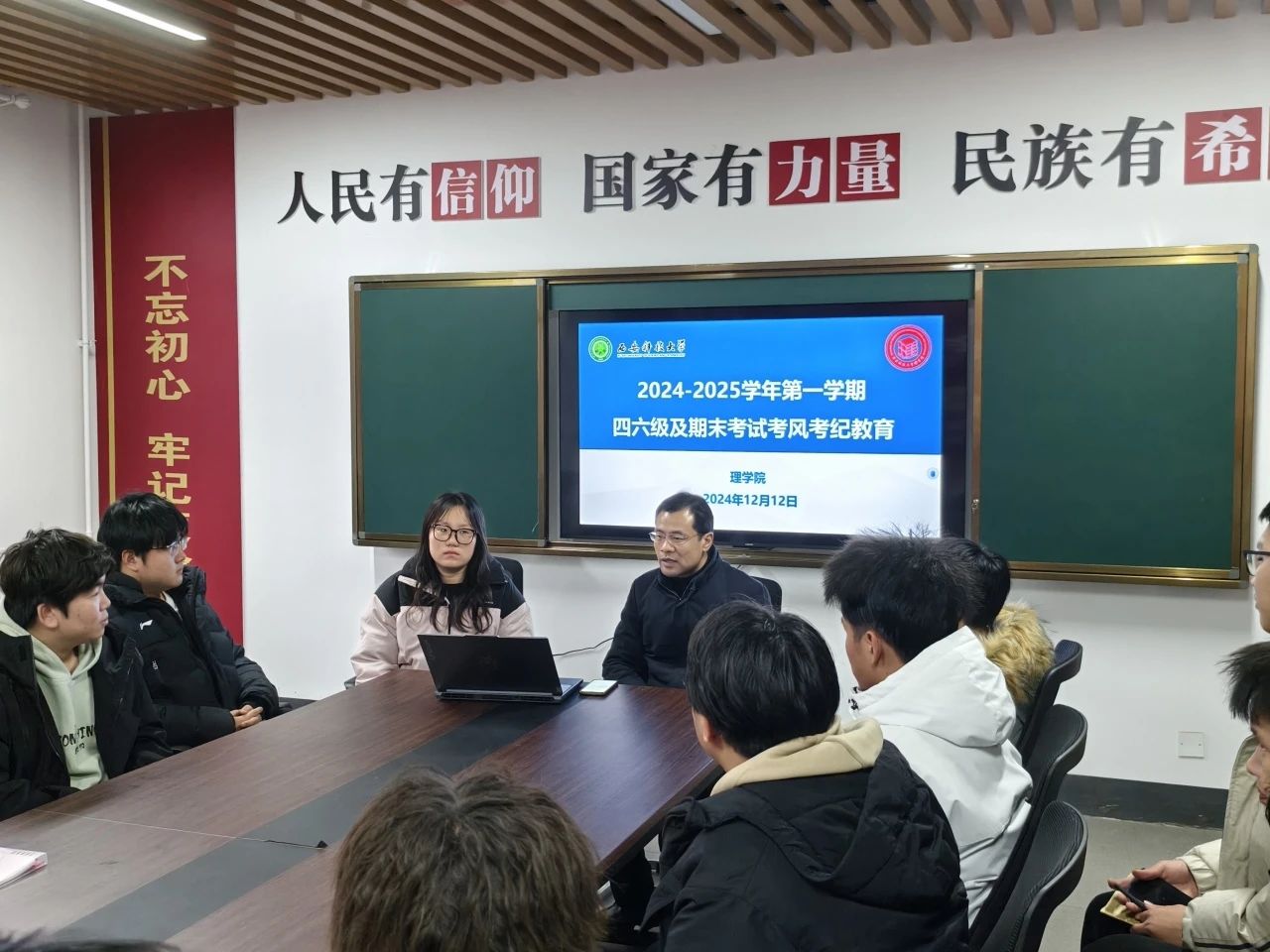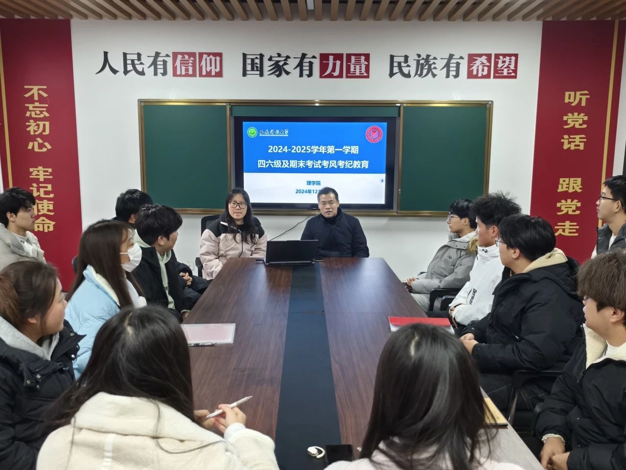 为营造优良学风,严肃考风考纪,助力员工学业提升与个人成长,确保四六级考试及期末考试顺利进行,12月12日,体育365官网于一站式社区召开了英语四六级及期末考试考风考纪教育会议,本次会议由院学工办主任侯斌刚和2024级辅导员薛一丹主持,2023级和2024级各班班长、团支书、学习委员参加。