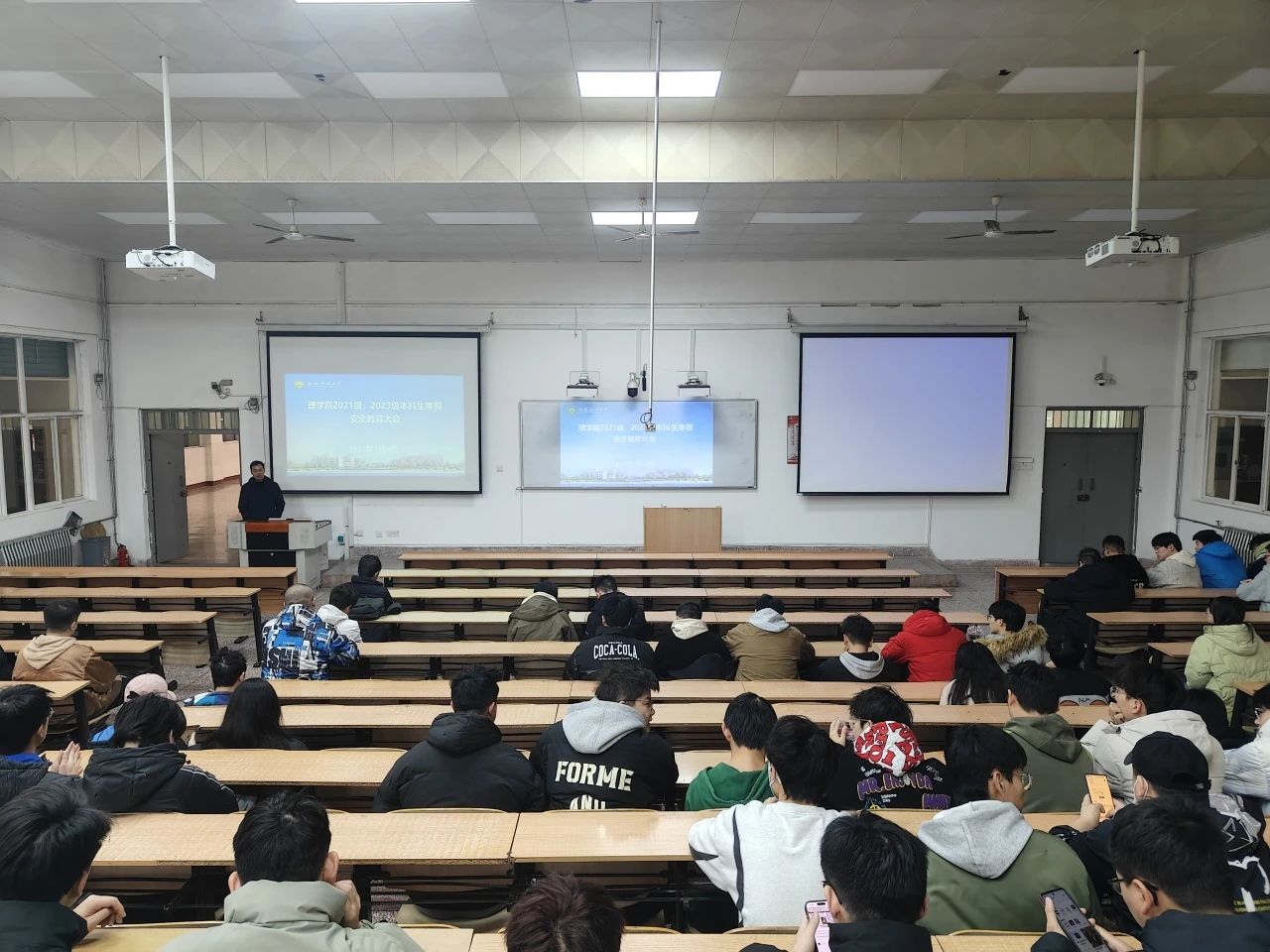 1月8日,体育365官网于3教208室召开了2021级、2023级本科生寒假安全教育大会,大会由2021级、2023级本科生辅导员侯斌刚主持,公司党委副书记陈伟伯以及2021级、2023级全体本科生参加。