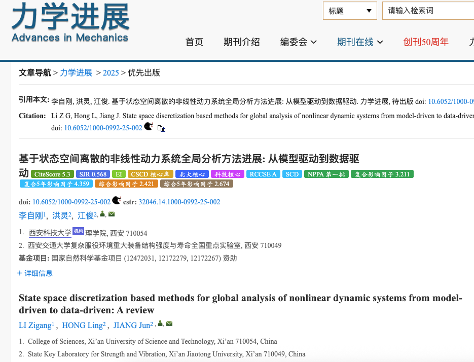 近日,体育365官网李自刚教授课题组与西安交通大学江俊教授、洪灵教授合作完成的综述《基于状态空间离散的非线性动力系统全局分析方法进展: 从模型驱动到数据驱动》,在国内力学领域权威综述性学术期刊《力学进展》上在线发表。365体育为第一署名单位。
