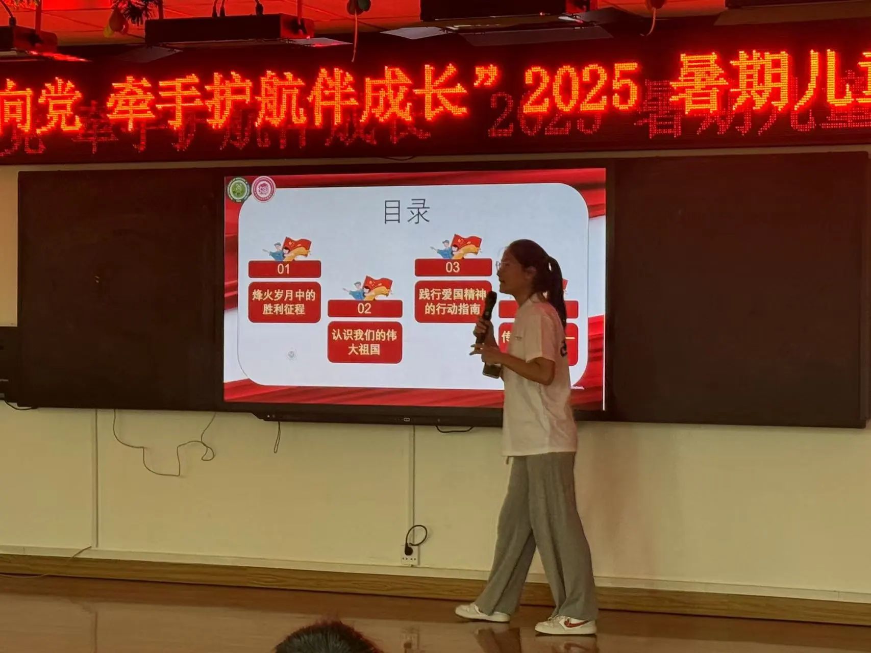 杨瑞欣同学以中国抗日战争胜利暨世界反法西斯战争胜利80周年为主题,为同学们带来了一场生动的爱国主义教育宣讲。宣讲过程中,杨瑞欣同学通过讲述历史故事、展示珍贵图片等方式,带领孩子们重温那段波澜壮阔的历史,让孩子们深刻感受到了革命先辈们的英勇无畏和爱国精神。为了增强互动性,杨瑞欣同学还设置了问答环节,孩子们积极踊跃发言,现场气氛热烈。对于回答正确的孩子,实践团精心准备了小奖品,以鼓励他们对历史知识的学习热情。