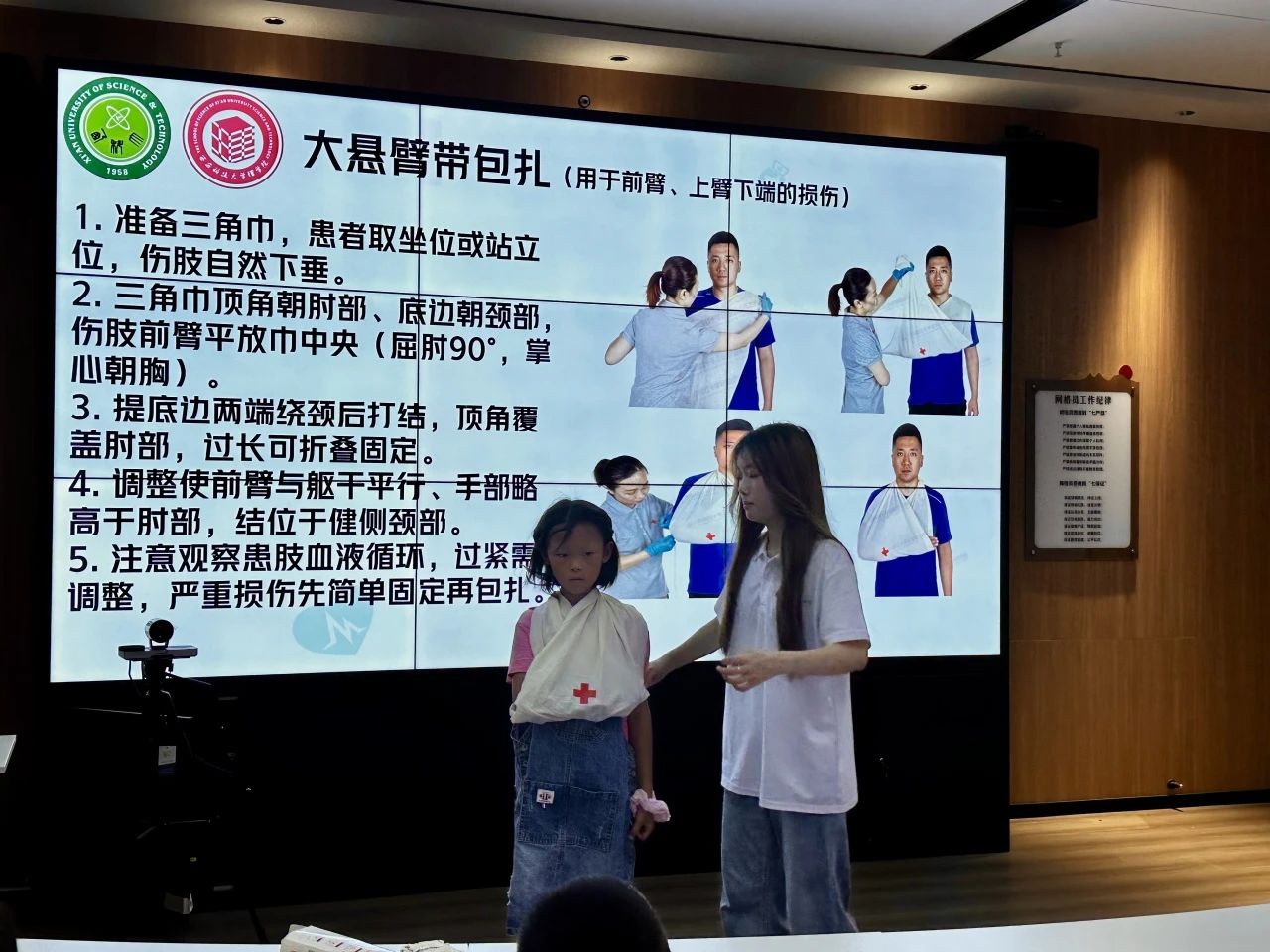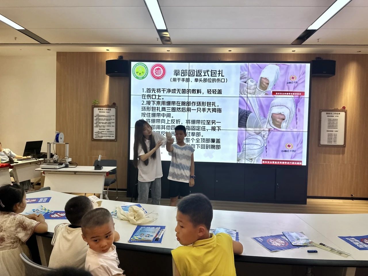廖秋凡结合农村常见的磕碰场景,手把手教孩子们如何正确缠绷带。“先绕两圈固定,再斜着交叉缠绕”,她一边演示一边讲解,孩子们跟着比划,有的还互相充当 “小伤员” 练习,在轻松的互动中掌握了实用的急救技巧