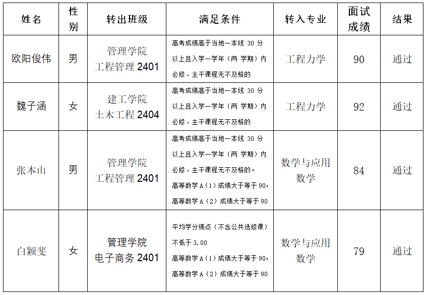 根据《关于开展2025年度本科生转专业工作的通知》(教务函〔2025〕49号),经个人申报,公司(部)审核,各专业组织面试,面试成绩与结果如下。对面试结果有异议者,请实名向体育365官网纪委或教务办公室反映。公示时间:2025年8月21日至23日。教务办公室:霍老师13991828118 公司纪委:陈书记15332473982