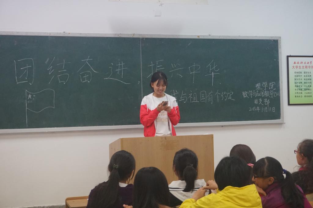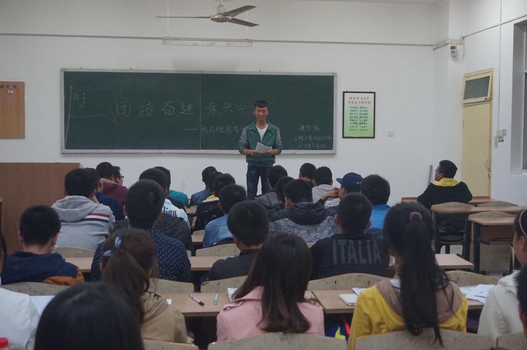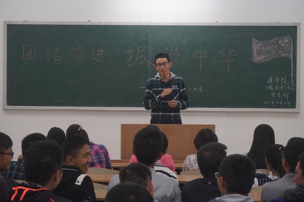 10月11日晚7:15体育365官网15级同学今晚开展了他们老员工涯的第一次团日活动,团日活动的主题是“团结奋进,振兴中华——我与祖国有个约定”,虽然给他们的准备时间不多,但他们仍是做出了一份让人满意的团日活动。